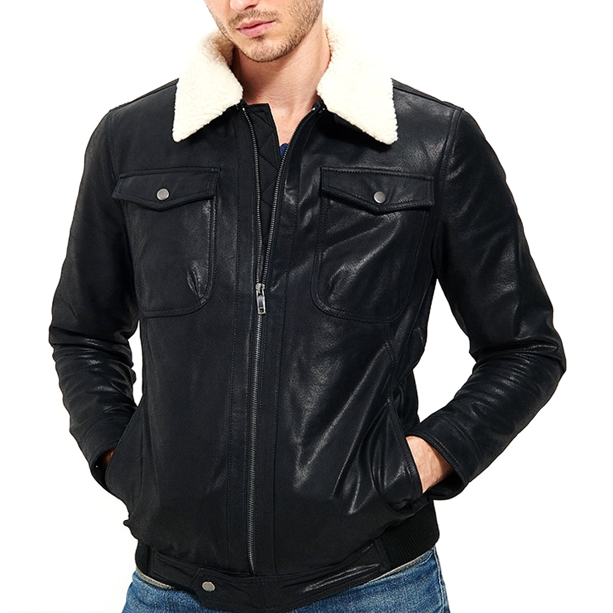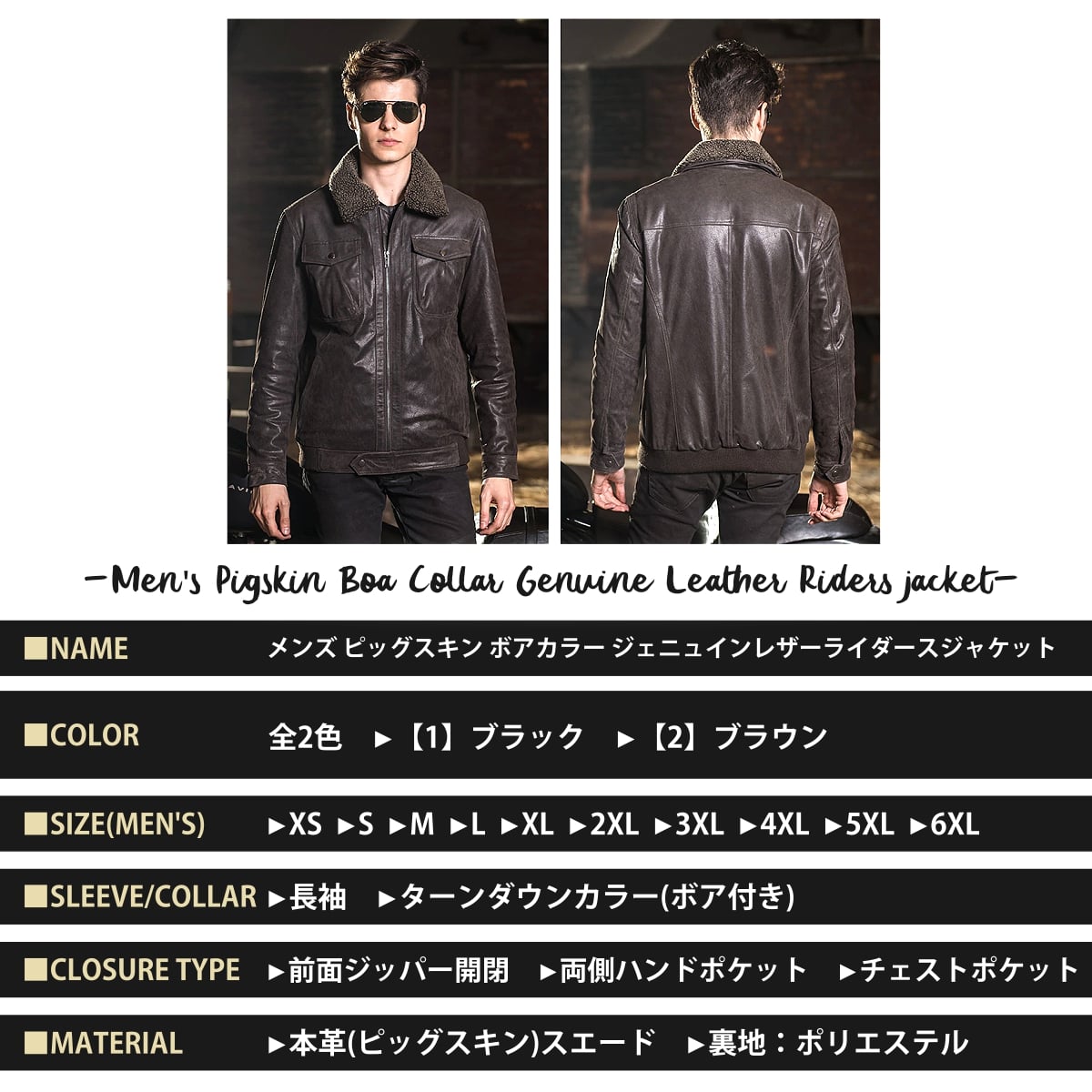 【送料無料!】全2色! 10サイズ! [Men's Pigskin Boa Collar Genuine Leather Riders Jacket] メンズ ピッグスキン ボアカラー ジェニュインレザー ライダースジャケット! 本革 豚革 ボンバージャケット フライトジャケット スエード コート アウター バイクに!